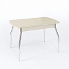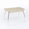 Столешница имеет размер 1 м 10 см, синхронно-раздвижной механизм “бабочка” позволяет увеличить ее еще на 30 см и увеличить количество посадочных мест. Материалы изготовления - ЛДСП, МДФ и закаленное стекло. В ассортименте варианты с цветным стеклом, с узором, с кожзамом, с фотопечатью и даже с искусственным камнем. Ножки могут быть гнутыми или прямыми, из хромированной стали или массива березы в одном из трех цветов - выбор комбинаций просто огромный.