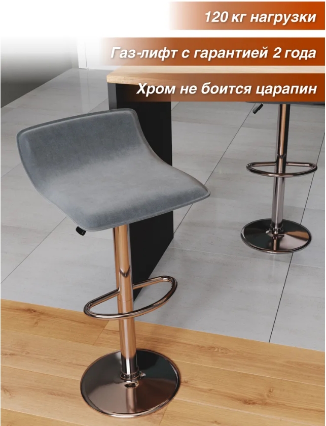 Стул имеет регулируемый механизм (хромированный газлифт), который изменяет высоту стула от 60 до 80 см. Этого достаточно, чтобы усадить с комфортом за стойку любого человека, любого возраста.
